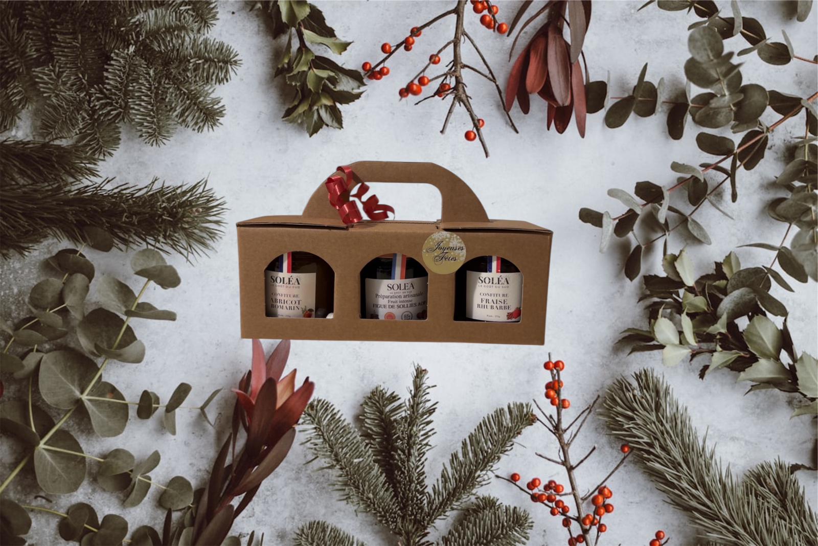 Une belle présentation pour ce pack de 3 confitures ou préparations artisanales à haute teneur en fruits - pour le plaisir d'offrir.
